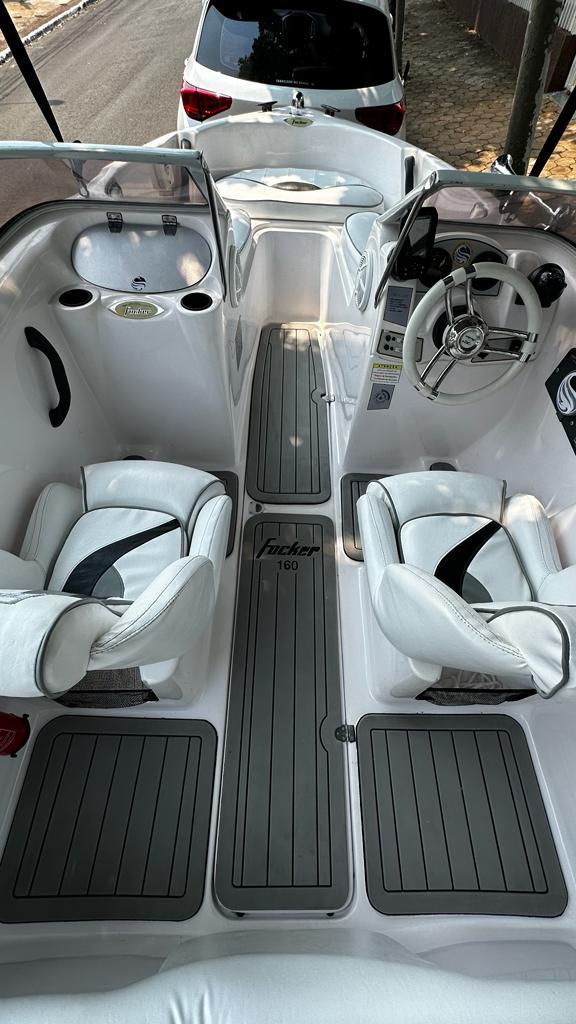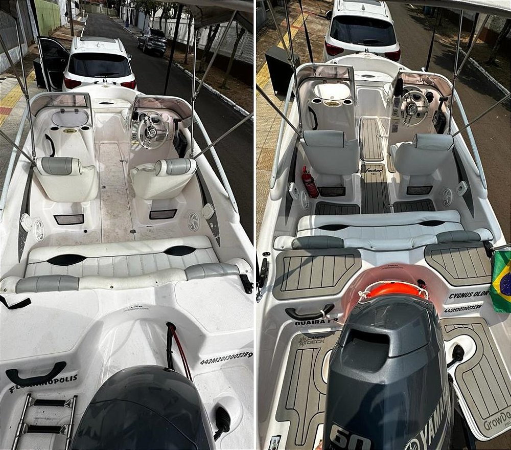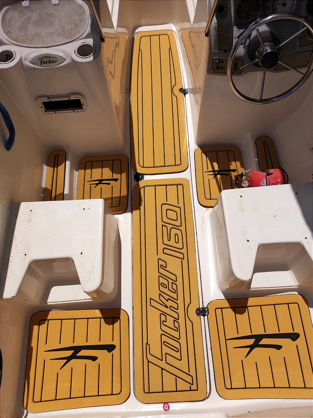Também conhecido como tapete náutico EVA, o piso Camon Deck para lancha Focker 160 é desenvolvido sob medida com tecnologia CNC de alta precisão. Fabricado em EVA náutico de alta densidade, oferece acabamento premium, conforto térmico e segurança total, mesmo com o piso molhado. Ideal para quem busca qualidade, estética e durabilidade no revestimento da embarcação.